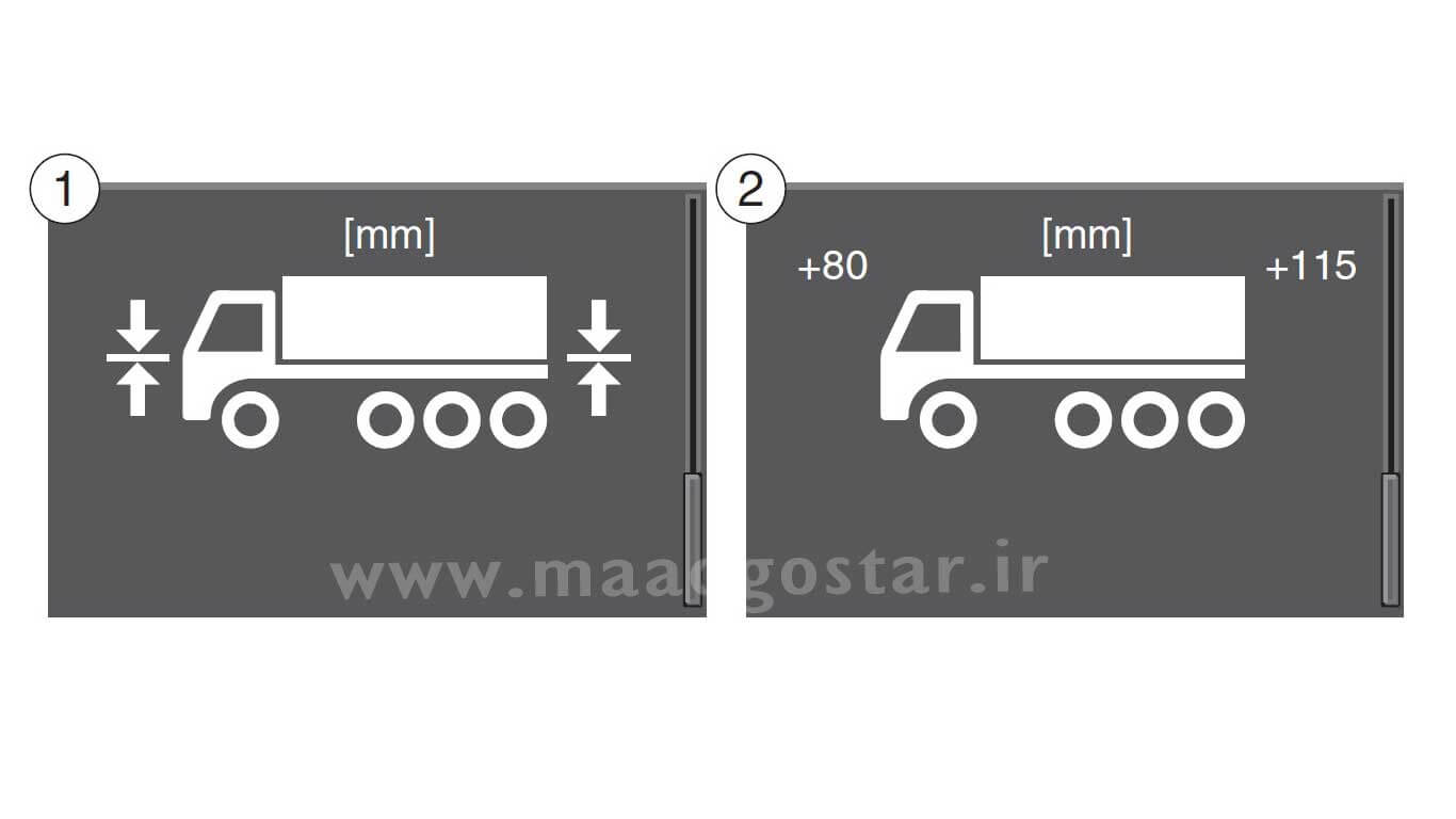 تصویر زیر نمونه ای از سنجش ارتفاع خودرو میباشد . تصویر سمت چپ شماره 1 خودرو در ارتفاع رانندگی قرار دارد و انحرافی ندارد . تصویر سمت راست شماره 2 خودرو دارای انحراف از ارتفاع رانندگی میباشد و میزان انحراف آن در قسمت جلو +80 میلیمتر و در قسمت عقب +115 میلیمتر میباشد .