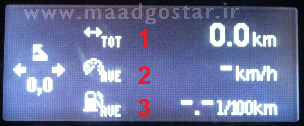 شماره 1: مسافت سفر . شماره 2: متوسط سرعت . شماره 3: متوسط مصرف سوخت .