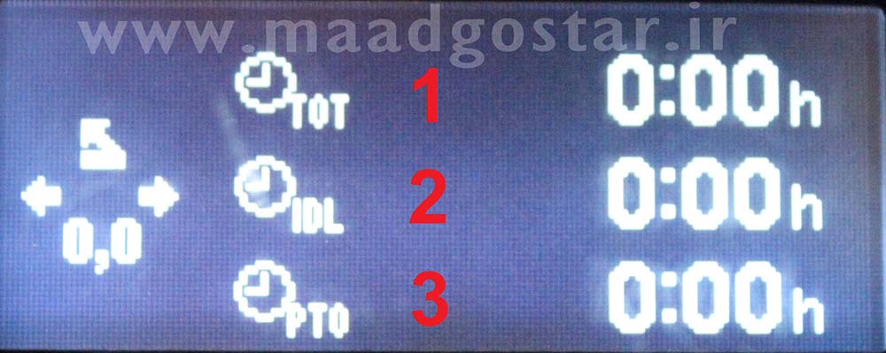 شماره 1: زمان کلی سفر . شماره 2: زمانی که خودرو ساکن بوده و درجا کارکرده است . شماره 3: زمانی که با سیستم ( PTO ) درگیر شده است .
