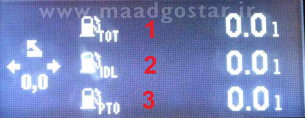 شماره 1: میزان کل مصرف سوخت . شماره 2: میزان مصرف سوخت در زمانهای درجاکارکردن و ساکن بودن خودرو . شماره 3: میزان مصرف سوخت در زمان درگیربودن با سیستم PTO .
