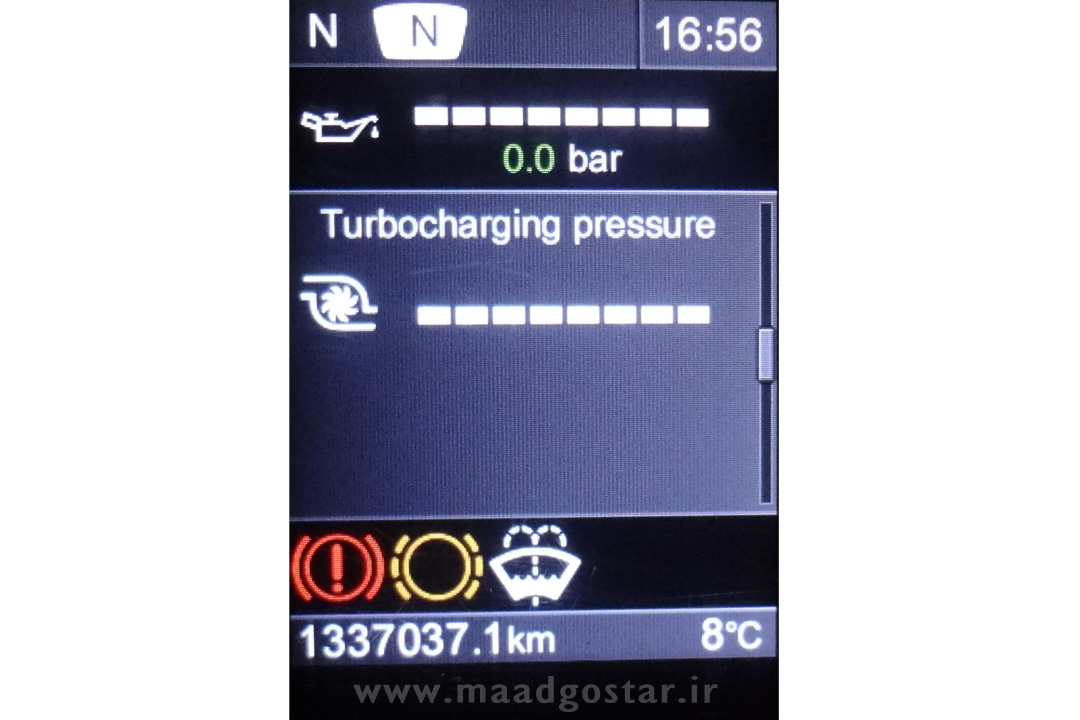 این قسمت فشار هوای ورودی ( توربو شارژ ) را نشان می دهد .(تصویر صفحه کیلومتر با زبان انگلیسی)