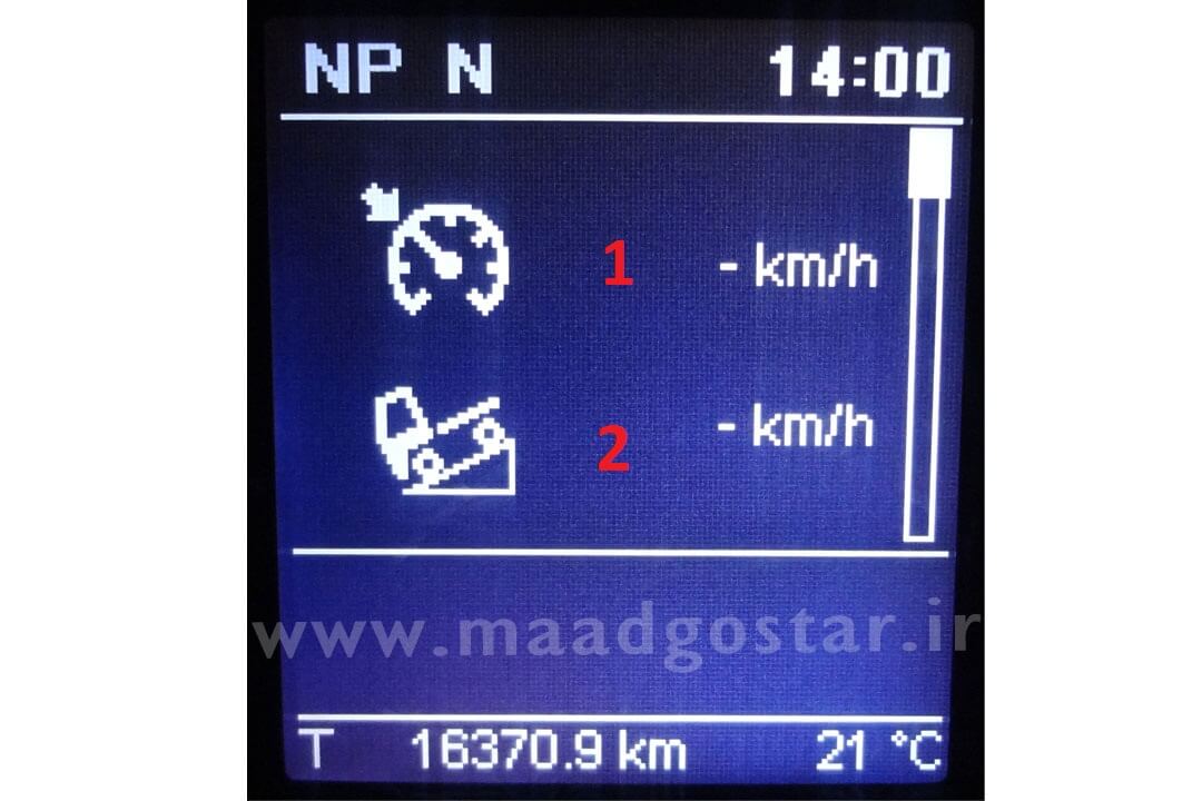 شماره 1 : سیستم کنترل سرعت ( کروز کنترل ) نشان داده میشود . شماره 2 : کنترل سرعت در سراشیبی نشان داده میشود . توجه داشته باشید در هر خودرو بر اساس آخرین تنظیمات اطلاعات در این قسمت نشان داده میشود .