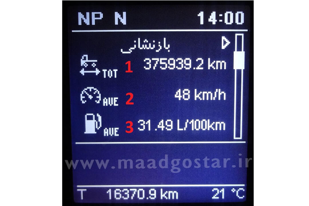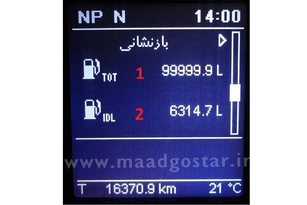 شماره 1 : میزان کل مصرف سوخت نشان داده شده است . شماره 2 : میزان مصرف سوخت در حالت کارکرد درجا خودرو نشان داده شده است .