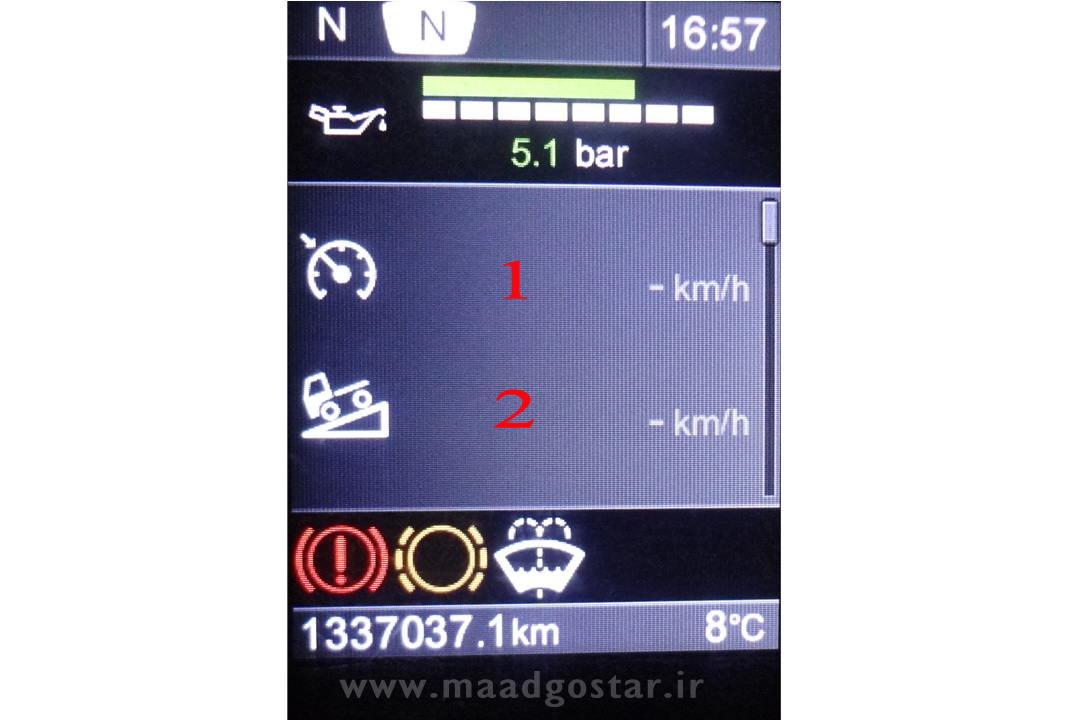 شماره 1 : سیستم کنترل سرعت (کروز کنترل) نشان داده می شود. شماره 2: کنترل سرعت در سراشیبی نشان داده می شود. توجه داشته باشید در هر خودرو بر اساس آخرین تنظیمات اطلاعات در این قسمت نشان داده می شود.
