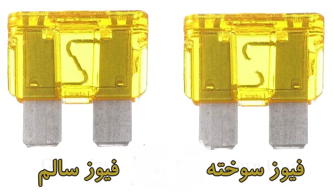 در تصویر بالا دو نمونه از فیوزهای سالم و سوخته نشان داده شده است .