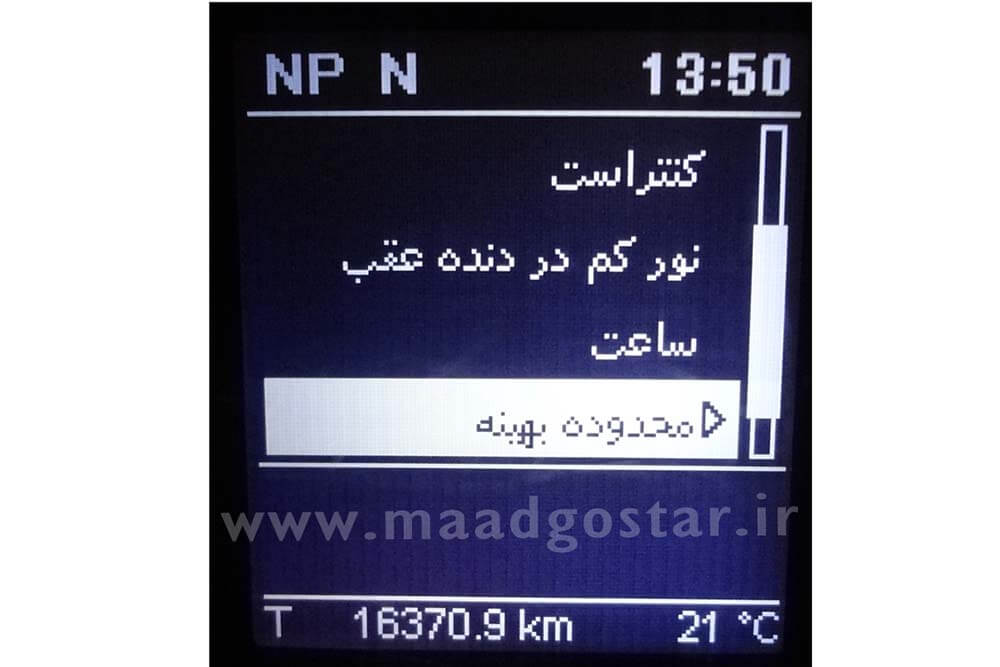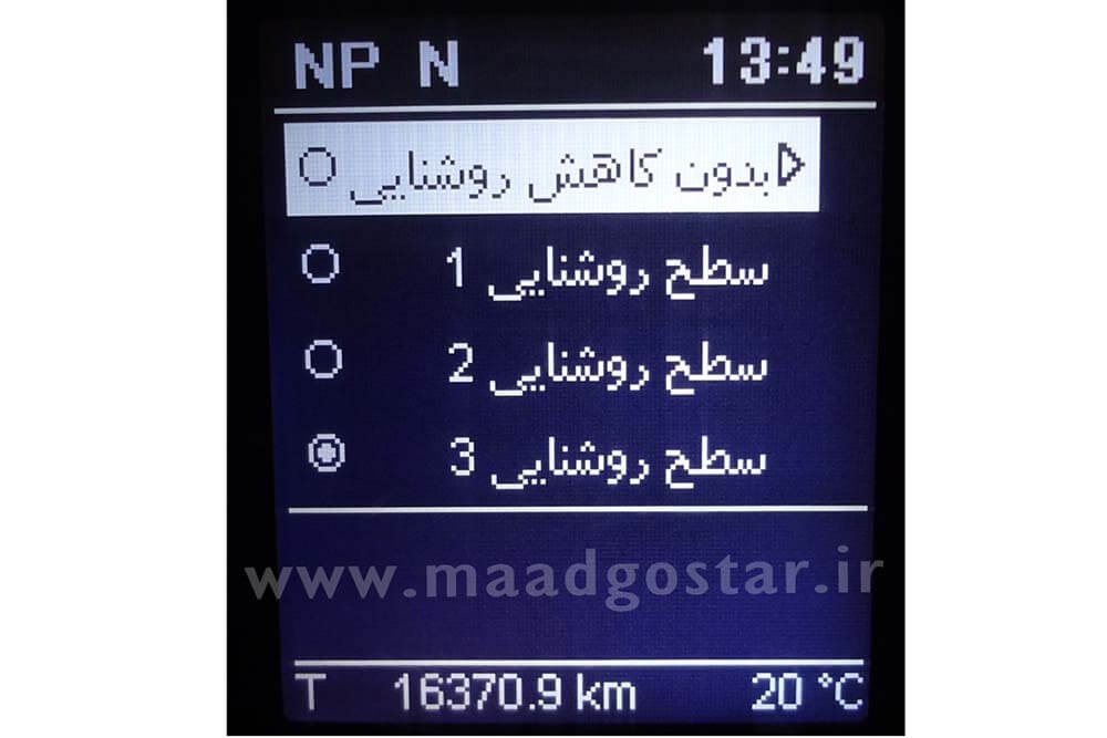 همانطور که در تصویر مشاهده میکنید بر اساس سلیقه راننده نور صفحه نمایشگر در زمان حرکت دنده عقب خودرو امکان تنظیم شدن دارد .