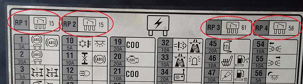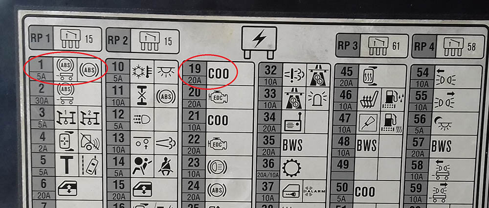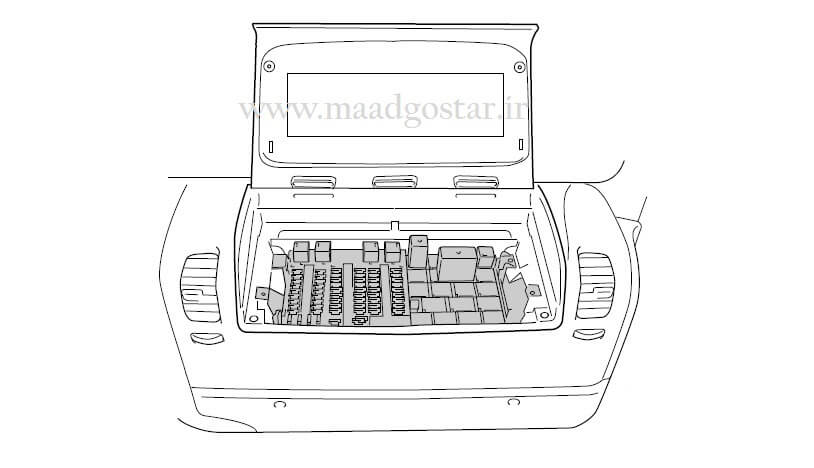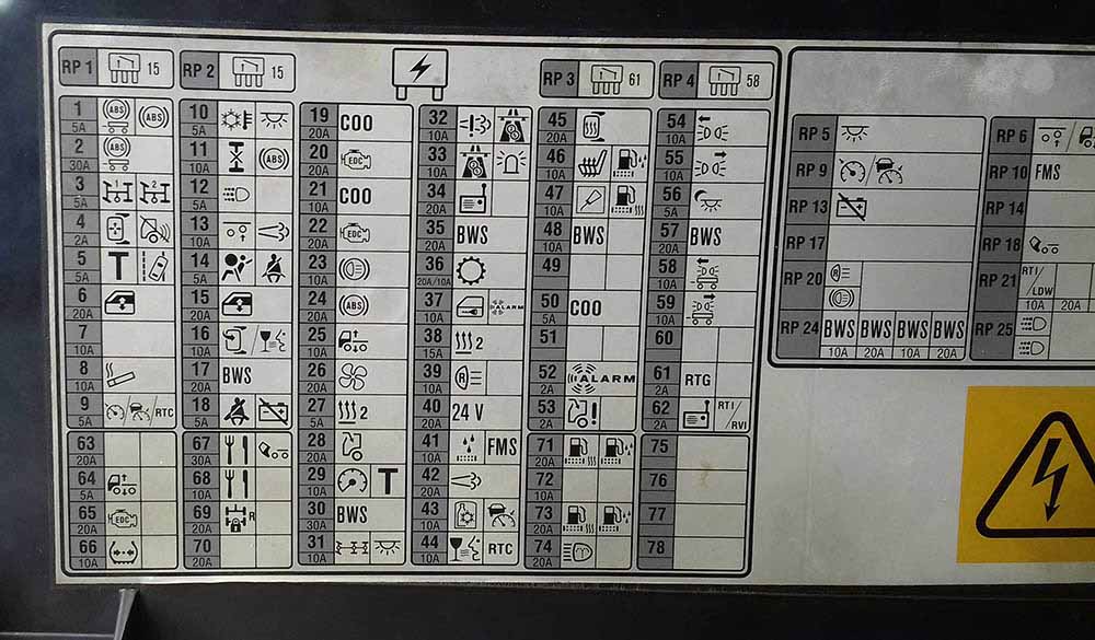 همانطور که در تصویر فوق ملاحظه میکنید در تصویر صفحه راهنما محل هر فیوز با شماره آن و مقدار جریان فیوز ، همچنین مصرف کننده ای که مربوط به آن فیوز می باشد مشخص شده است . بعنوان مثال فیوز شماره یک 1 مقدار جریان آن 5 آمپر میباشد و مربوط به قسمت ABS کامیون و تریلر می باشد .