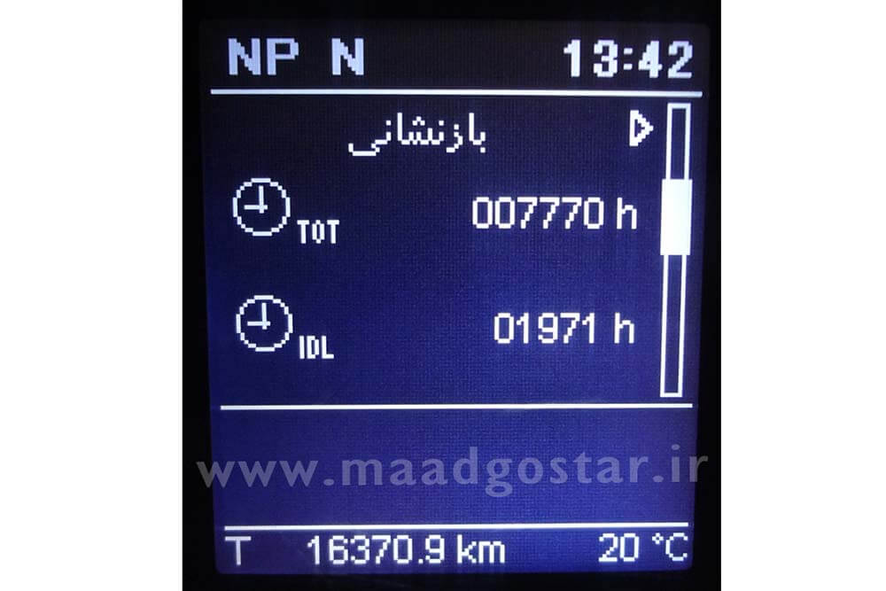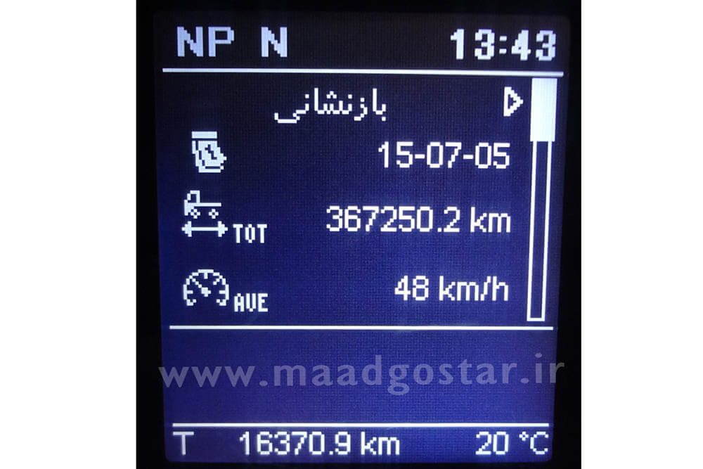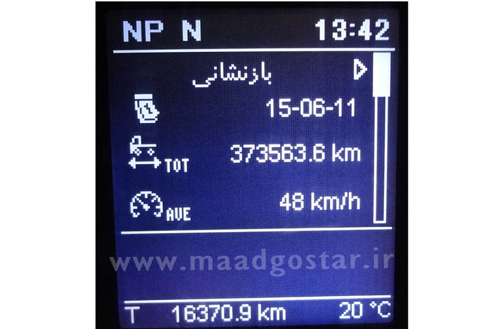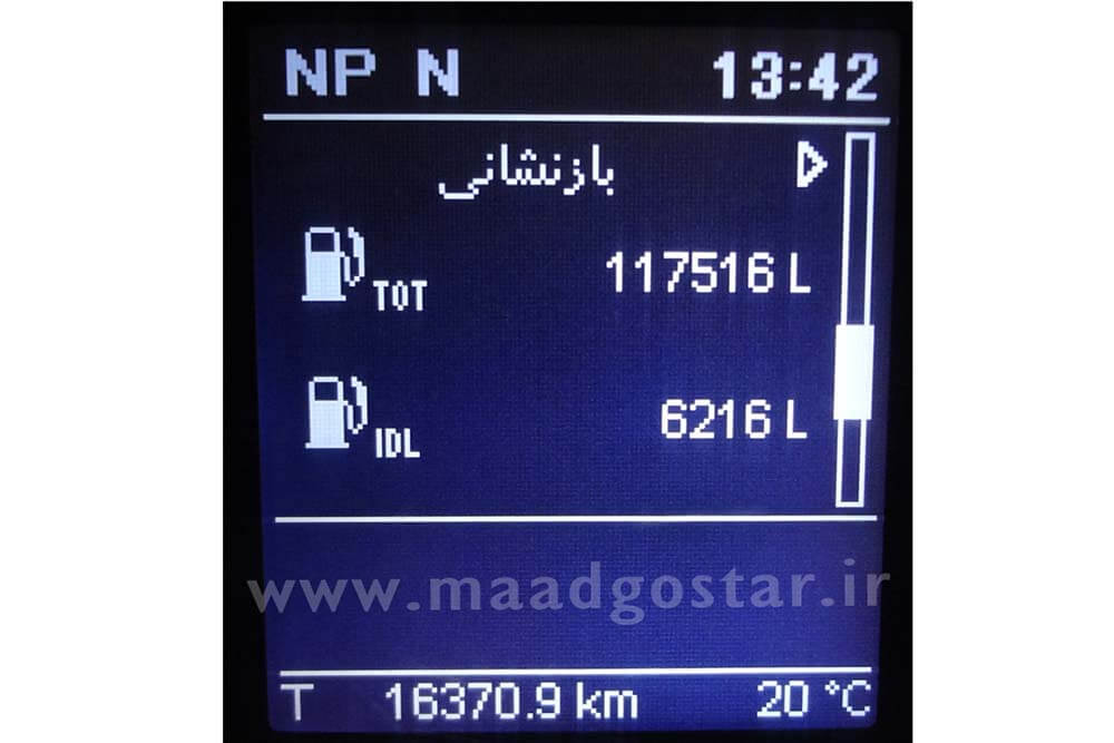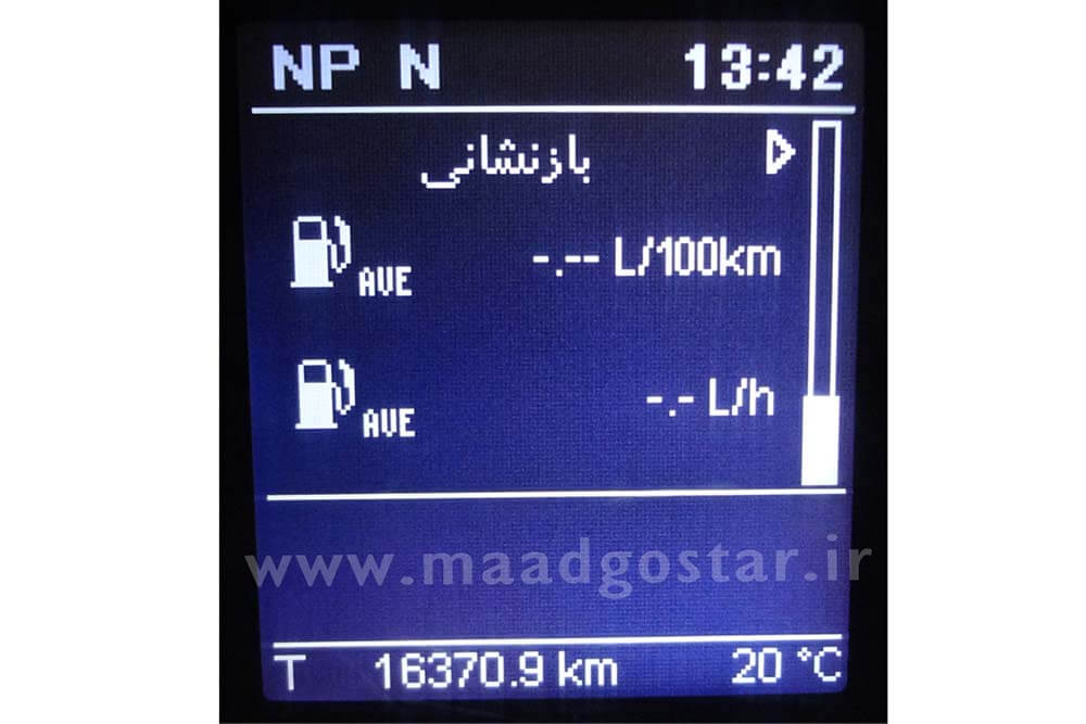 این قسمت میزان کل مصرف سوخت در سفر ، همچنین میزان مصرف سوخت در حالت کارکرد درجا خودرو در سفر را نشان میدهد . جهت بازنشانی از منوی بالای این قسمت استفاده نمائید .