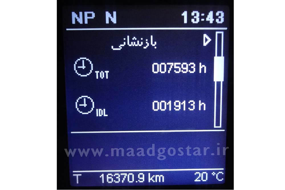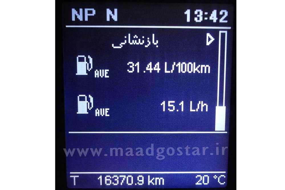 در این قسمت میانگین مصرف سوخت بر اساس لیتر بر 100 کیلومتر مسافت ، همچنین میانگین مصرف سوخت بر اساس لیتر بر ساعت نشان داده میشود . جهت بازنشانی از منوی بالای این قسمت استفاده نمائید .