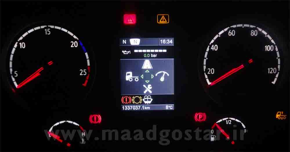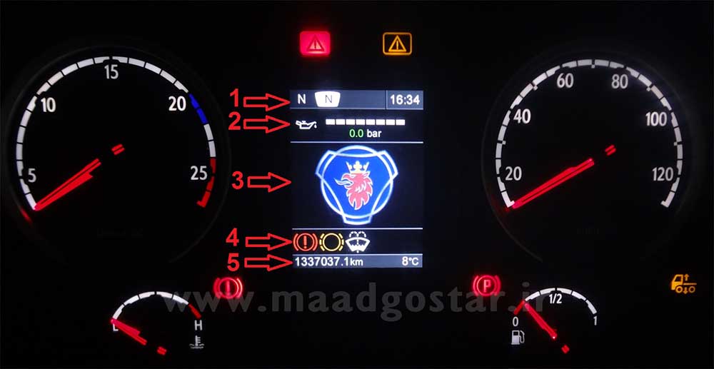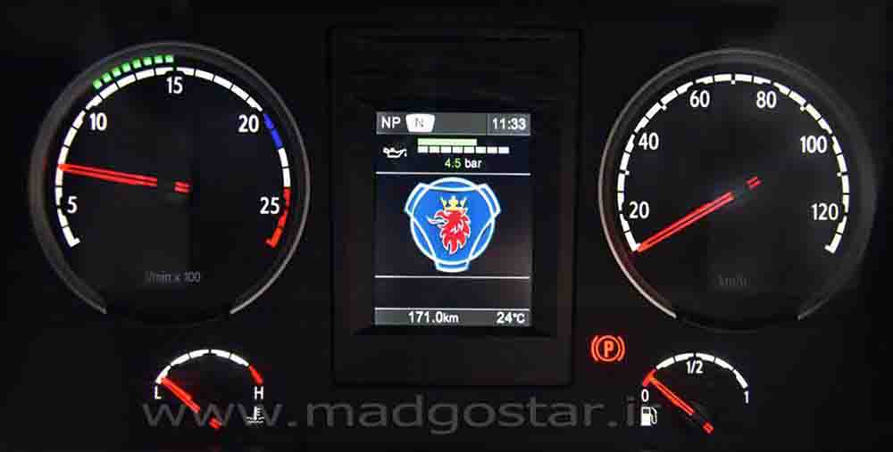 همانطور که در قسمت معرفی انواع صفحه کیلومتر گفته شد کمپانی اسکانیا بر اساس مدلهای تولیدی و سال ساخت چندین مدل صفحه کیلومتر بر روی محصولات خود نصب نموده است . یکی از مهمترین قسمت هایی که در صفحه کیلومترهای اسکانیا با یکدیگر متفاوت میباشند صفحه نمایش آن میباشد . در صفحه نمایش اطلاعات مهم و مختلفی نشان داده میشود . این مدل صفحه نمایش نسبت به مدل سیاه و سفید (دو رنگ) بزرگتر بوده و همچنین این نمایشگر رنگی میباشد . همانطور که در تصویر ملاحظه میفرمائید نمایشگر به پنج قسمت تقسیم شده و هر قسمت اطلاعات مخصوص خود را نشان میدهد که بشرح زیر میباشد . 1- ردیف اول مربوط به اطلاعات مربوط به گیربکس و نمایش زمان ( ساعت ) میباشد . 2- ردیف دوم مربوط به فیلد قابل برنامه ریزی می باشد ، شما میتوانید انتخاب که چه اطلاعاتی نمایش داده شود . 3- ردیف سوم مربوط به کادرهای پیام ها ، متن های هشدار و منوها میباشد . 4- ردیف چهارم مربوط به کادر ویژه نمادهای هشدار میباشد . 5- ردیف پنجم مربوط به مسافت طی شده ، هشدار لغزش و دمای بیرون میباشد . هشدار لغزندگی زمانی نمایش داده میشود که دمای بیرون حدود نقطه انجماد ( صفر درجه ) باشد .