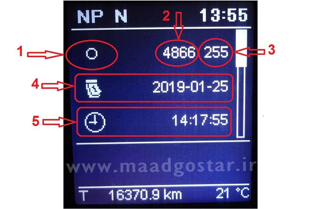 1- نماد دایره تو پر نشان میدهد که کد خطا هنگام بازیابی از کنترل یونیت فعال بوده است . معمولاً این مورد بدین معناست که علت بروز نقص همچنان برطرف نشده است . نماد دایر تو خالی نشان میدهد که کد خطا هنگام بازیابی از کنترل یونیت غیر فعال بوده است . 2- شماره کد خطا . با استفاده از این کد شما در صفحه عیب یابی برنامه میتوانید شرح و علت بروز خطا را مشاهده نمایید . 3- تعداد دفعاتی که یک خطا با شماره کد خطای مشخص شده رخ داده است . 4- تاریخ وقوع خطا . 5- ساعت وقوع خطا .