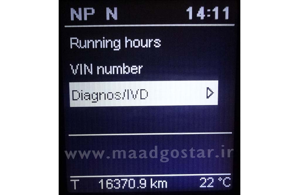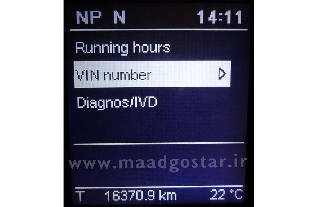 همانطور که در تصویر مشاهده میکنید این منو دارای سه قسمت میباشد : 1- ساعات کارکرد . 2- شماره شناسایی خودرو . 3- سیستم عیب یابی ( ایرادات IVD ) . بترتیب توضیحات هر قسمت را ارائه مینمائیم .