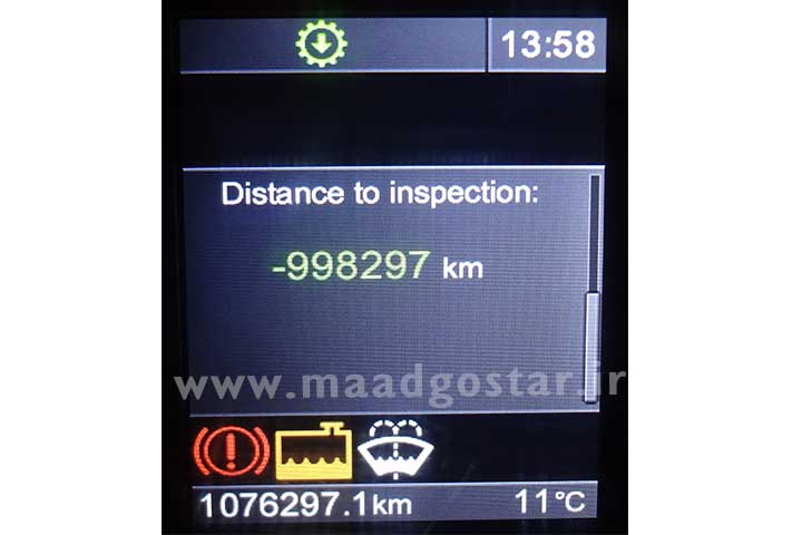 این قسمت میزان فاصله تا زمان سرویس خودرو نشان داده می شود. در صورتیکه از فاصله سرویس بگذرد و تنظیمات آن بازنشانی نگردد این مقدار به صورت منفی نشان داده می شود.