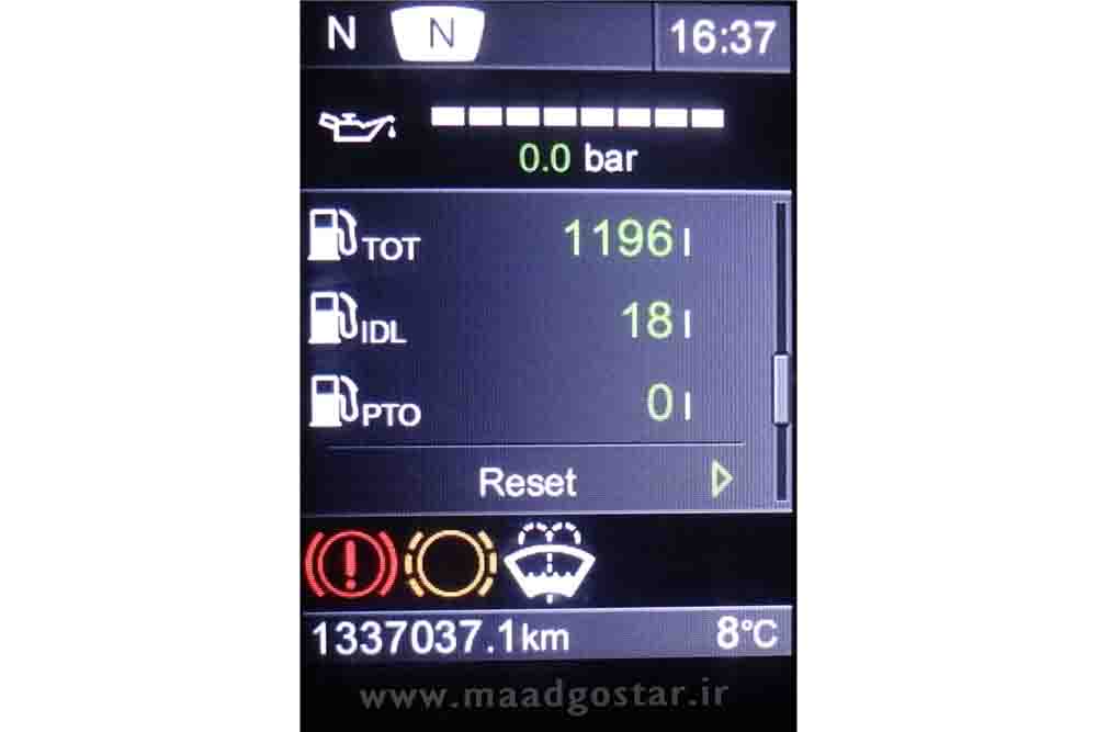 در این قسمت میانگین مصرف سوخت بر اساس لیتر بر 100 کیلومتر مسافت ، همچنین میانگین مصرف سوخت بر اساس لیتر بر ساعت نشان داده میشود . جهت بازنشانی از منوی بالای این قسمت استفاده نمائید .