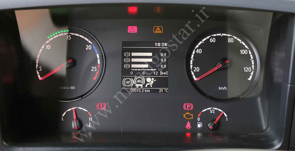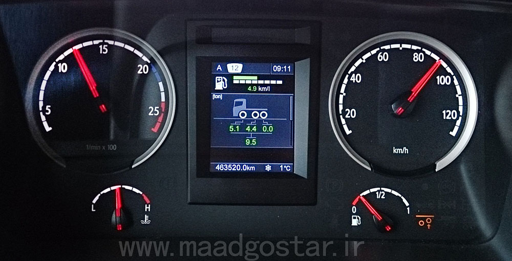 صفحه کیلومتر اروپائی اسکانیا . این مدل صفحه کیلومتر متعلق به کامیون هایی می باشد که مونتاژ اروپا بوده و بطور کامل از اروپا وارد ایران شده اند .